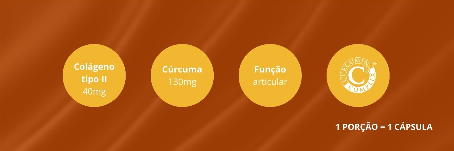 Colágeno Tipo II + Cúrcuma: apenas 1 Cápsula ao dia.