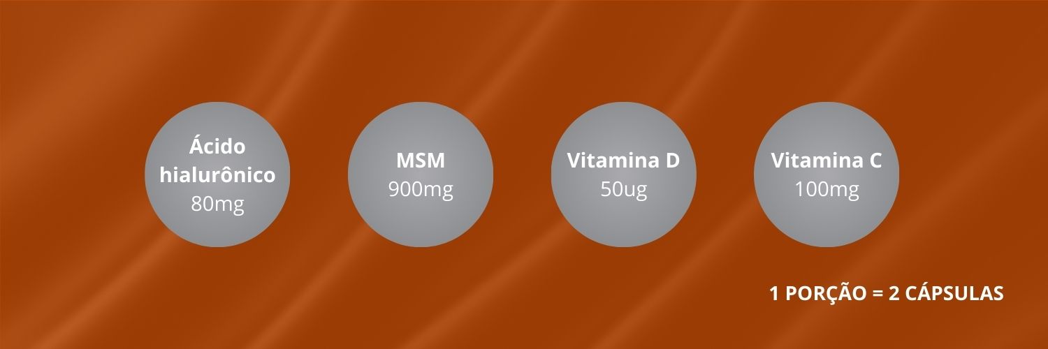 O que compõe a fórmula?Ácido hialurônico, colágeno tipo II não desnaturado, MSM, vitaminas C e D3.