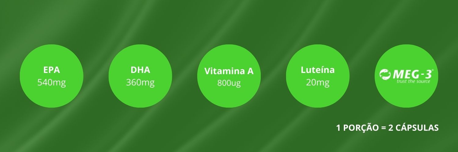 Qual a composição do Ômega 3 com Astaxantina, Luteína e Zeaxantina?Cada dose diária (2 cápsulas) fornece 540 mg de EPA, 360 mg de DHA, 1 mg de Astaxantina, 20 mg de Luteína, 2 mg de Zeaxantina, 15 mg de Vitamina E e Vitamina A.