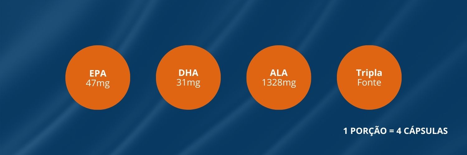 Qual a composição por dose?47 mg de EPA, 31 mg de DHA e 1.328 mg de ALA.